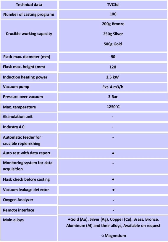 TVCd คือเครื่องหล่อแบบสุญญากาศแรงดันสูงที่ออกแบบมาเพื่อตอบสนองความต้องการที่เข้มงวดมากขึ้นในการผลิตแบบหล่อขี้ผึ้งหาย เครื่องนี้ทำงานด้วยแนวคิดห้องคู่แบบใหม่ที่ปฏิวัติวงการ ระบบที่เป็นนวัตกรรมนี้มีข้อดีหลายประการเมื่อเทียบกับระบบดูดสุญญากาศห้องเดียวแบบดั้งเดิมที่มีอยู่ในตลาดปัจจุบัน ใน TVCd ห้องหลอมและห้องหล่อแยกจากกันอย่างสมบูรณ์ และในขณะที่ทำการหล่อ เครื่องจะควบคุมการฉีดโลหะเข้าไปในแม่พิมพ์โดยใช้แรงดันที่แตกต่างกันในระหว่างการเท ซึ่งนำไปสู่การฉีดที่เร็วกว่าเมื่อเทียบกับการเทด้วยแรงโน้มถ่วงเพียงอย่างเดียว และมีประโยชน์ในการหล่อชิ้นงานที่อุณหภูมิต่ำกว่า ผลลัพธ์ที่ได้คือผิวชิ้นงานที่เรียบเนียนกว่า