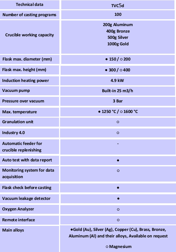 TVCd คือเครื่องหล่อแบบสุญญากาศแรงดันสูงที่ออกแบบมาเพื่อตอบสนองความต้องการที่เข้มงวดมากขึ้นในการผลิตแบบหล่อขี้ผึ้งหาย เครื่องนี้ทำงานด้วยแนวคิดห้องคู่แบบใหม่ที่ปฏิวัติวงการ ระบบที่เป็นนวัตกรรมนี้มีข้อดีหลายประการเมื่อเทียบกับระบบดูดสุญญากาศห้องเดียวแบบดั้งเดิมที่มีอยู่ในตลาดปัจจุบัน ใน TVCd ห้องหลอมและห้องหล่อแยกจากกันอย่างสมบูรณ์ และในขณะที่ทำการหล่อ เครื่องจะควบคุมการฉีดโลหะเข้าไปในแม่พิมพ์โดยใช้แรงดันที่แตกต่างกันในระหว่างการเท ซึ่งนำไปสู่การฉีดที่เร็วกว่าเมื่อเทียบกับการเทด้วยแรงโน้มถ่วงเพียงอย่างเดียว และมีประโยชน์ในการหล่อชิ้นงานที่อุณหภูมิต่ำกว่า ผลลัพธ์ที่ได้คือผิวชิ้นงานที่เรียบเนียนกว่า