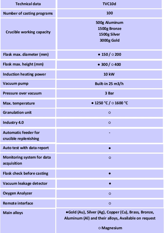 TVCd คือเครื่องหล่อแบบสุญญากาศแรงดันสูงที่ออกแบบมาเพื่อตอบสนองความต้องการที่เข้มงวดมากขึ้นในการผลิตแบบหล่อขี้ผึ้งหาย เครื่องนี้ทำงานด้วยแนวคิดห้องคู่แบบใหม่ที่ปฏิวัติวงการ ระบบที่เป็นนวัตกรรมนี้มีข้อดีหลายประการเมื่อเทียบกับระบบดูดสุญญากาศห้องเดียวแบบดั้งเดิมที่มีอยู่ในตลาดปัจจุบัน ใน TVCd ห้องหลอมและห้องหล่อแยกจากกันอย่างสมบูรณ์ และในขณะที่ทำการหล่อ เครื่องจะควบคุมการฉีดโลหะเข้าไปในแม่พิมพ์โดยใช้แรงดันที่แตกต่างกันในระหว่างการเท ซึ่งนำไปสู่การฉีดที่เร็วกว่าเมื่อเทียบกับการเทด้วยแรงโน้มถ่วงเพียงอย่างเดียว และมีประโยชน์ในการหล่อชิ้นงานที่อุณหภูมิต่ำกว่า ผลลัพธ์ที่ได้คือผิวชิ้นงานที่เรียบเนียนกว่า